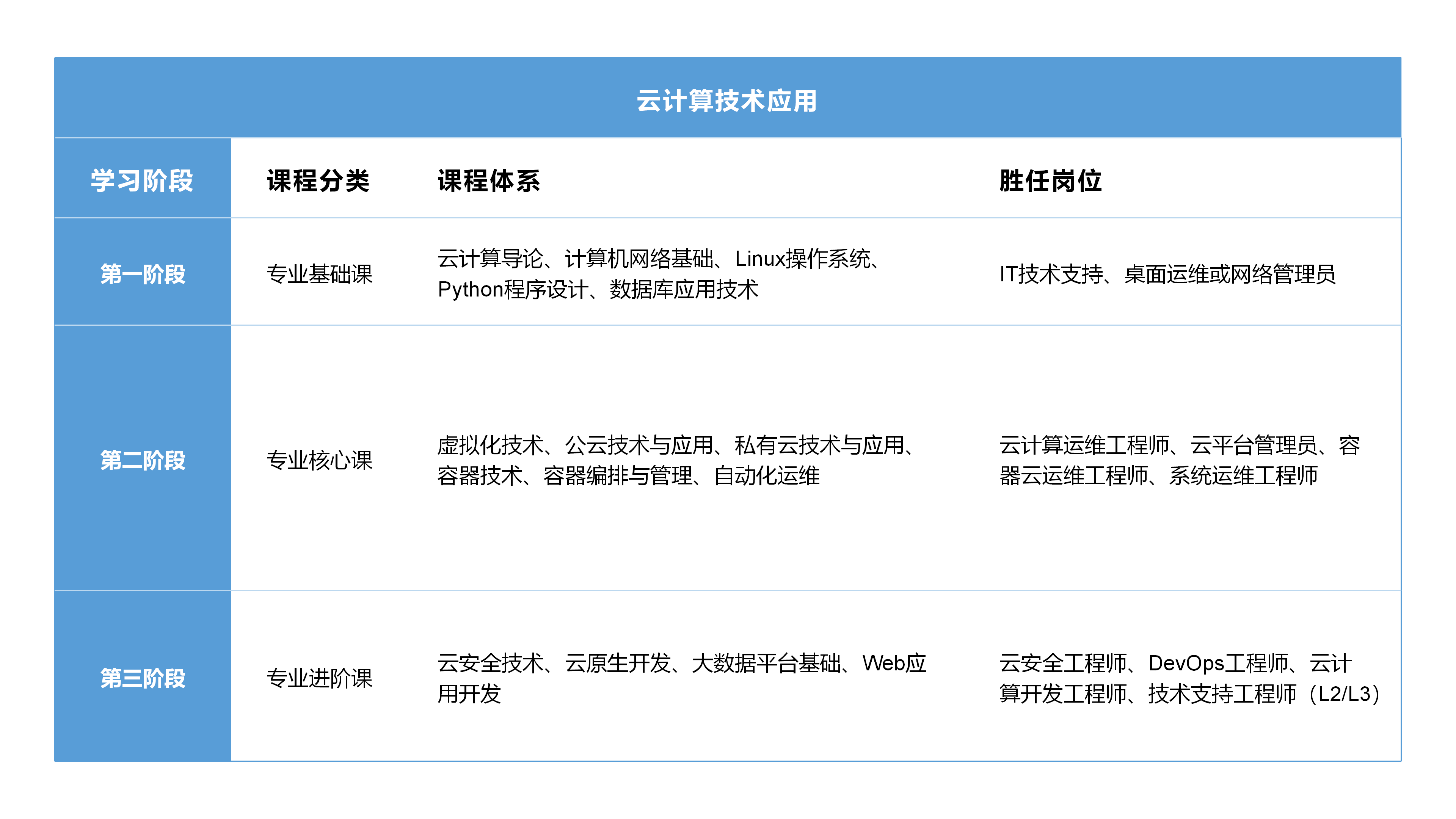 云计算技术应用专业聚焦云计算架构搭建、资源管理与应用开发,是支撑数字经济发展的核心专业。课程体系涵盖云计算基础、虚拟化技术、云平台部署、容器技术、云存储与云网络配置等,同步融入云安全、云原生开发等前沿内容,注重实践操作。
